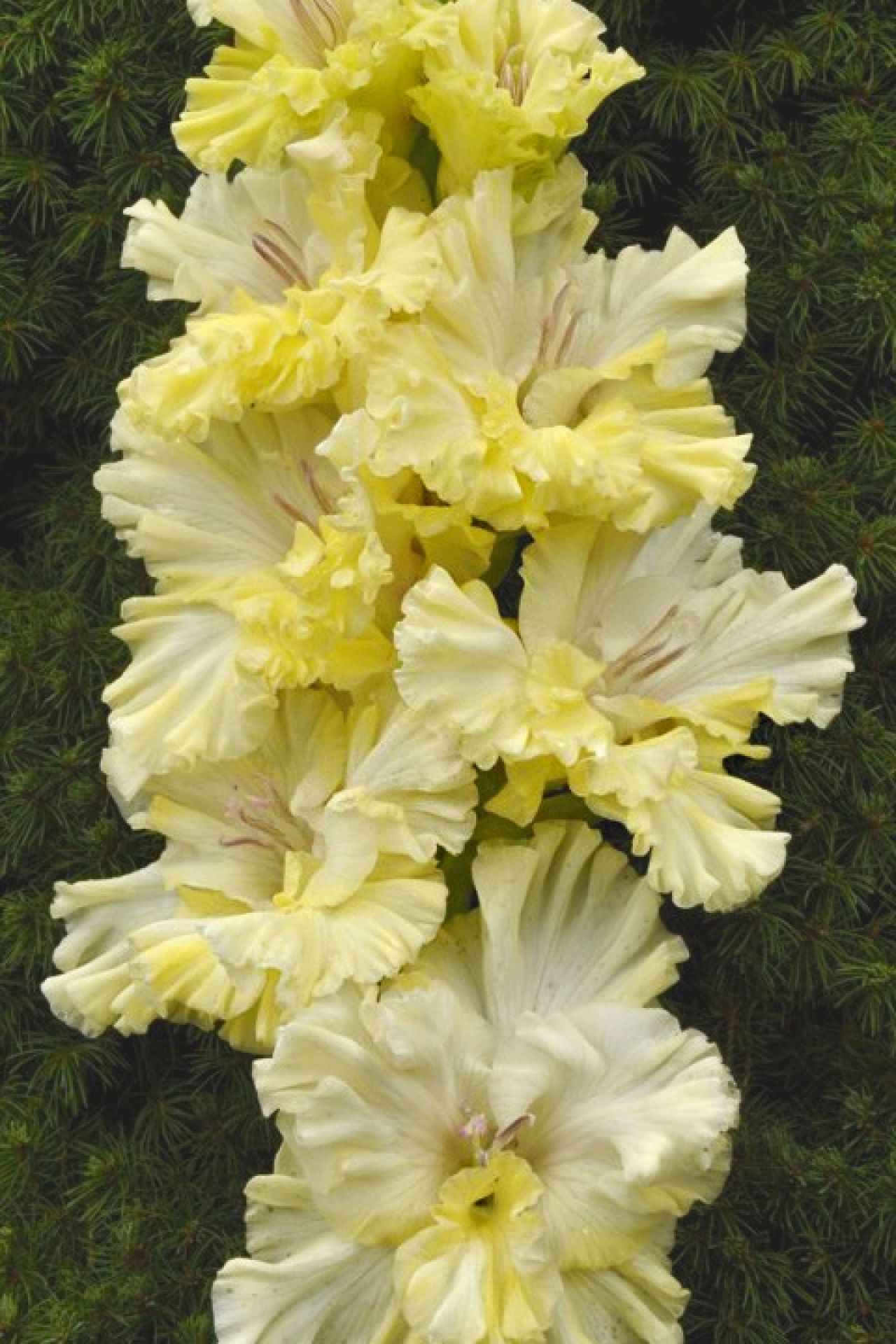 Гладиолус Виктория – это великолепный цветок с насыщенно-желтыми лепестками, которые имеют изящную супергофрировку. Цветок формирует плотный двухрядный колос, а его окраска становится более интенсивной к основанию.