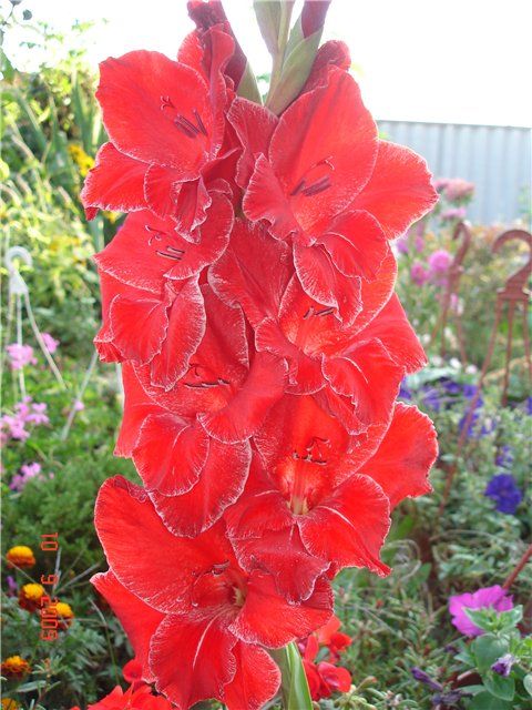 Гладиолус "Венец" - это величественный и элегантный цветок! Этот сорт-гигант, предназначенный для срезки, достигает высоты 160 см. Его мощное двухрядное соцветие привлекает внимание насыщенно-красным цветом с широкой серебристой каймой по краям лепестков. В горле цветка также присутствует серебристый муар, а на двух нижних лепестках можно увидеть четкие белые стрелки, доходящие до половины лепестка. Лепестки имеют бархатистую текстуру.