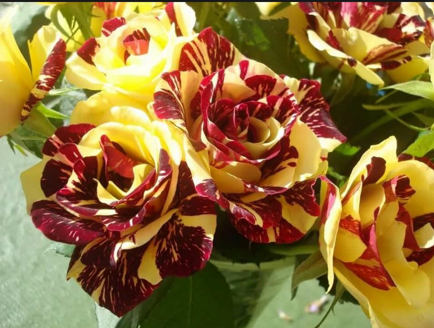 Цветки розы Сим Салабим имеют бокаловидную форму и достигают диаметра 10 см. Лепестки ярко-лимонного цвета украшены темно-бордовыми бархатными полосами, вкраплениями и точками, что создает эффектную и пеструю цветовую гамму. В одном цветке насчитывается около 25 махровых лепестков, которые раскрываются по спирали. Цветы источают легкий, нежный и ненавязчивый аромат. На одном стебле может образоваться до 15 цветов, собранных в соцветия.