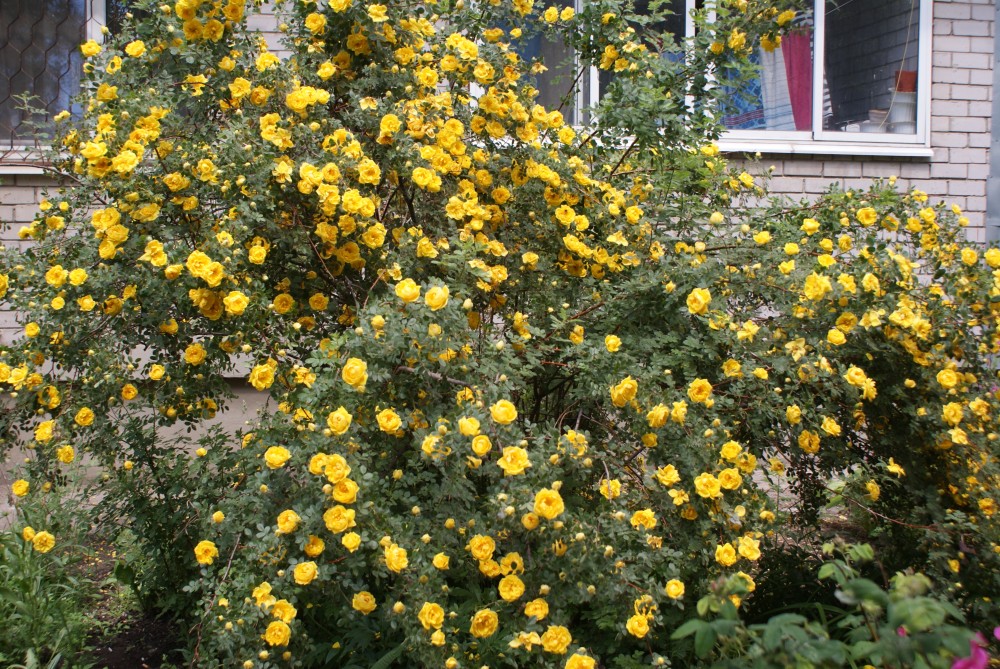 Эта уникальная разновидность шиповника отличается отсутствием ягод, что делает её идеальной для создания живых изгородей и использования в ландшафтном дизайне. Кустарники данного сорта достигают высоты до 2 метров. Их побеги светло-коричневого цвета и обладают гибкостью. Листья продолговатые, тёмно-зелёные, состоящие из 9 тонких лепестков шириной не более 2 см. Цветение начинается в начале июля, когда кусты покрываются махровыми цветками насыщенного жёлтого оттенка. Из-за обильного цветения растениям требуется дополнительная опора.
